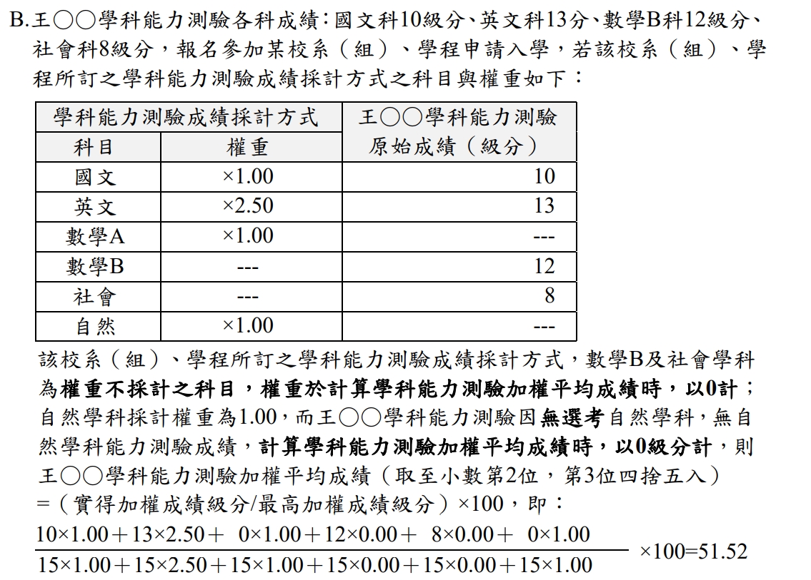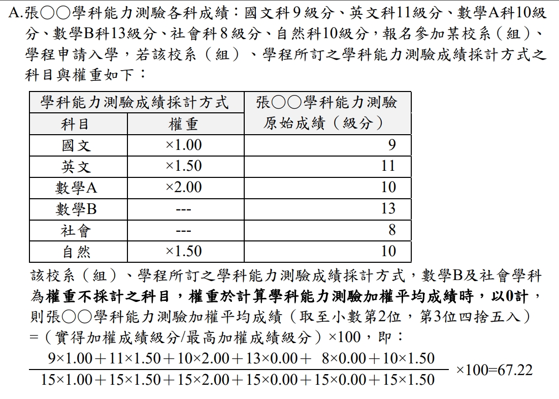 - 本校第一階段最低篩選標準係依招生簡章總則(第7頁)「學科能力測驗成績採計方式」欄位中,各科目採計權重計算其加權平均級分,並經轉換成百分制後(取至小數第 2 位,第3位四捨五入)之「學科能力測驗加權平均成績」。